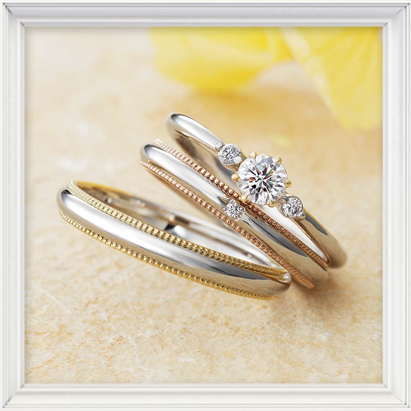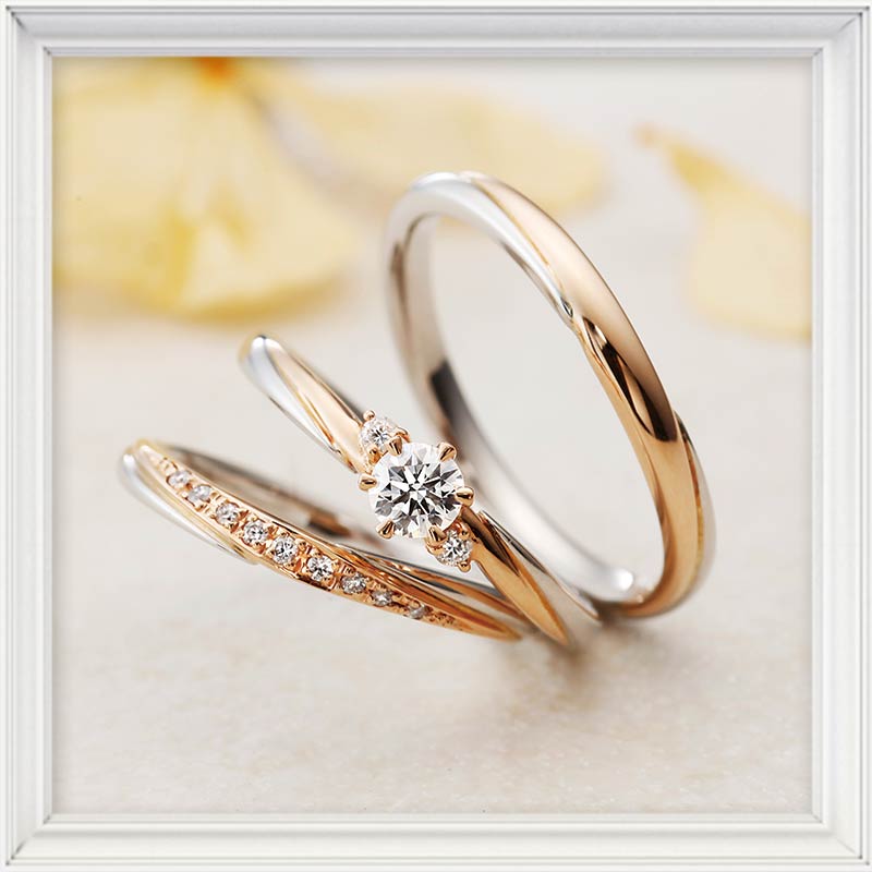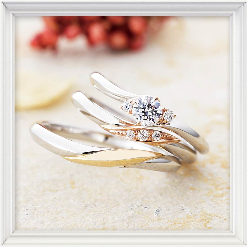 「コンビリング」とは、1本のリングの中で プラチナとゴールドなど異なる金属を組み合わせる デザインのリングのこと。異素材を組むことで、それぞれの金属の美しさを活かしつつ、唯一無二の質感と個性が生まれます。