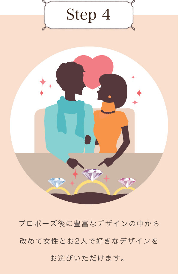 このプランなら、プロポーズ後彼女と一緒にデザインが選べるので、サプライズの【感動】と一緒に選べる【楽しみ】が両方叶って、彼女にも満足してもらえるはずです。