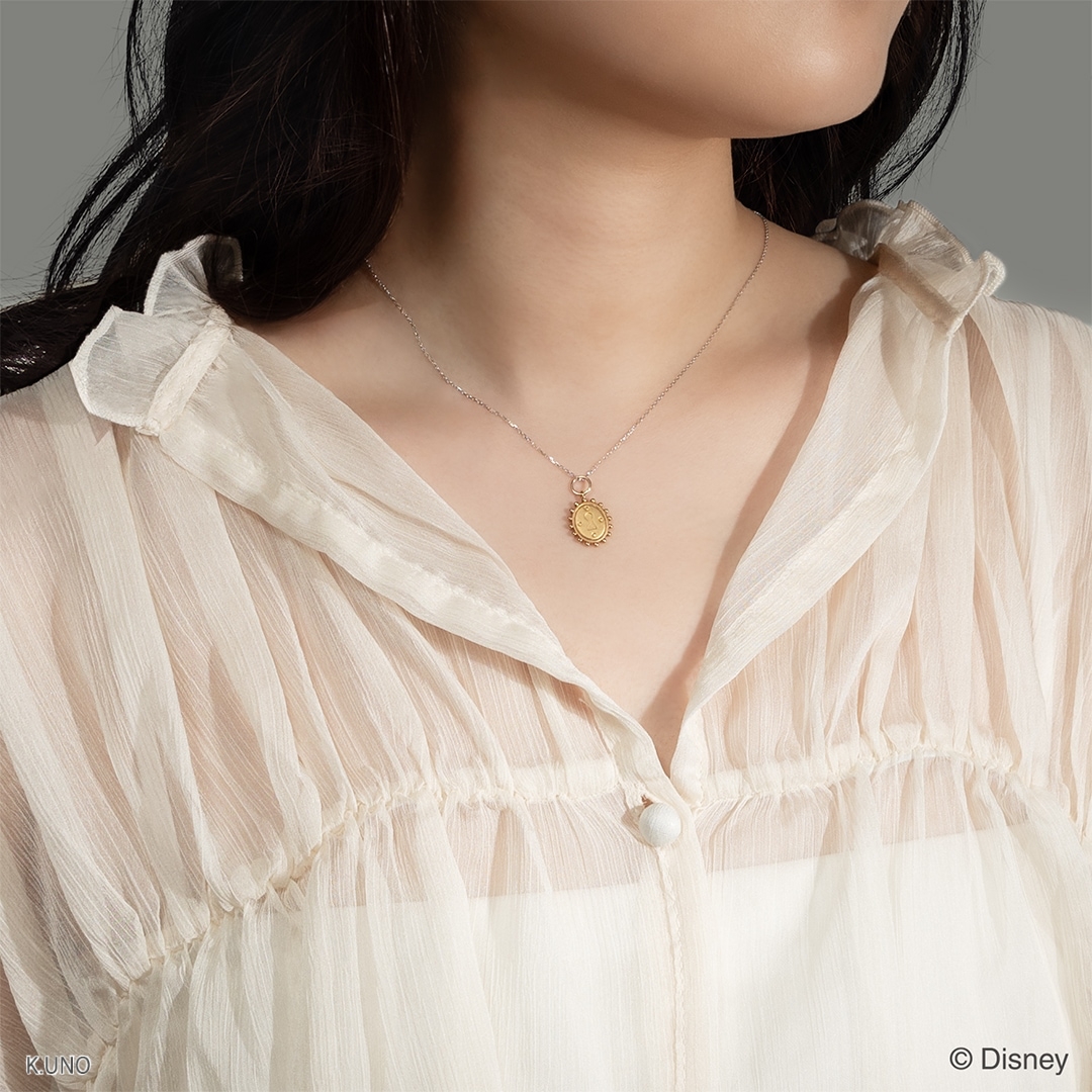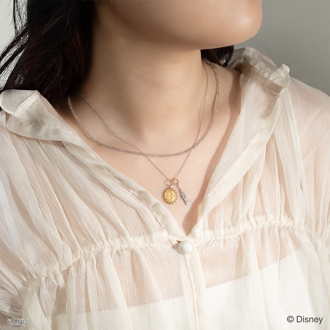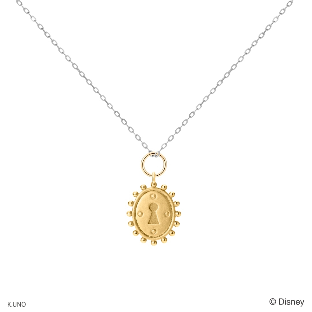 「ティンカー・ベル」が引き出しの中に入ってしまったシーンをイメージし、表側は鍵穴のモチーフをデザイン。裏側には「ティンカー・ベル」の横顔のシルエットを忍ばせて。まるい金属の装飾で、可愛らしくクラシカルな印象に仕上げました。