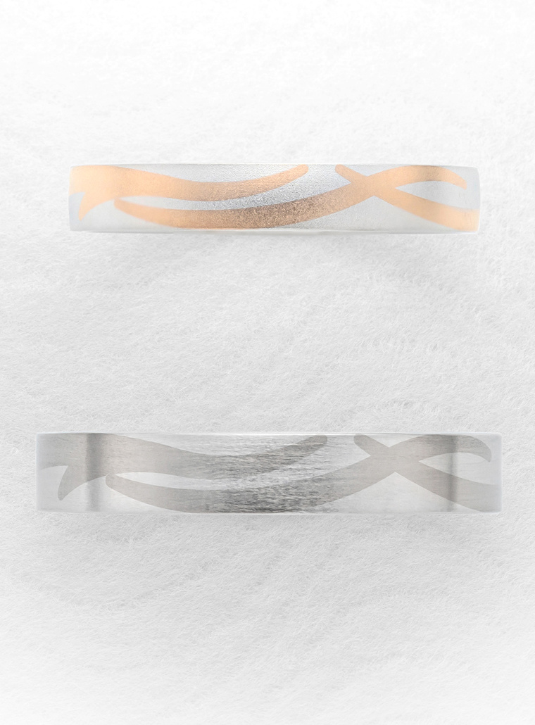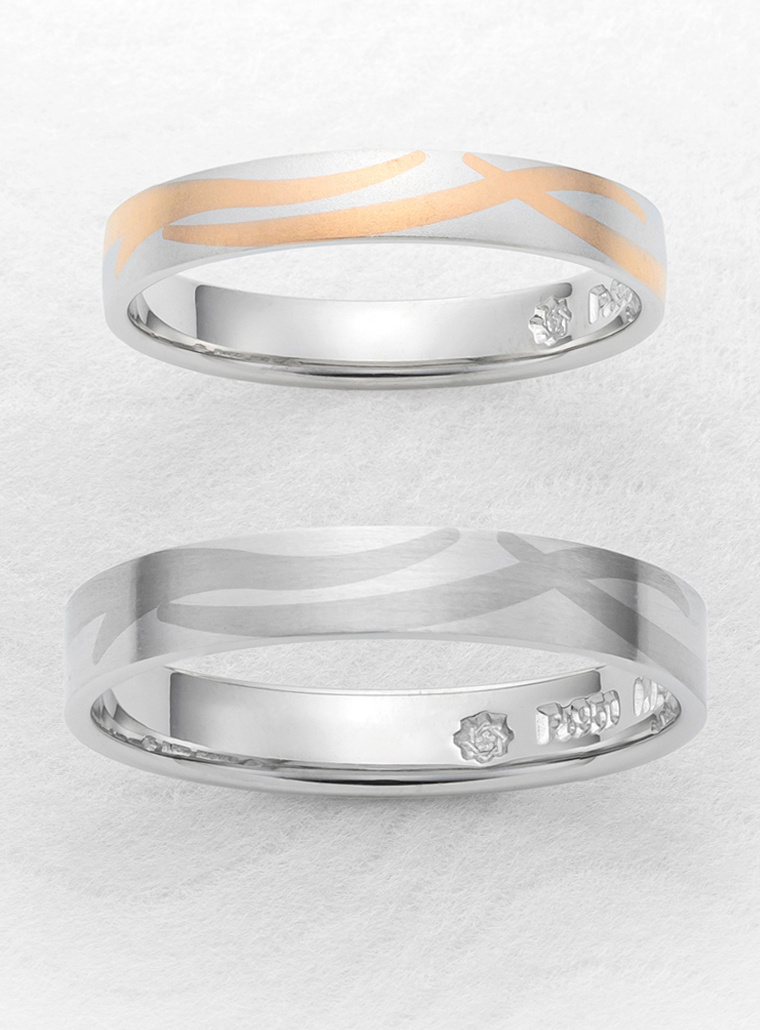 維新の風をイメージして作られた指輪はプラチナ950をベースにピンクゴールとホワイトゴールドを組み合わせ、印象的なリングに。