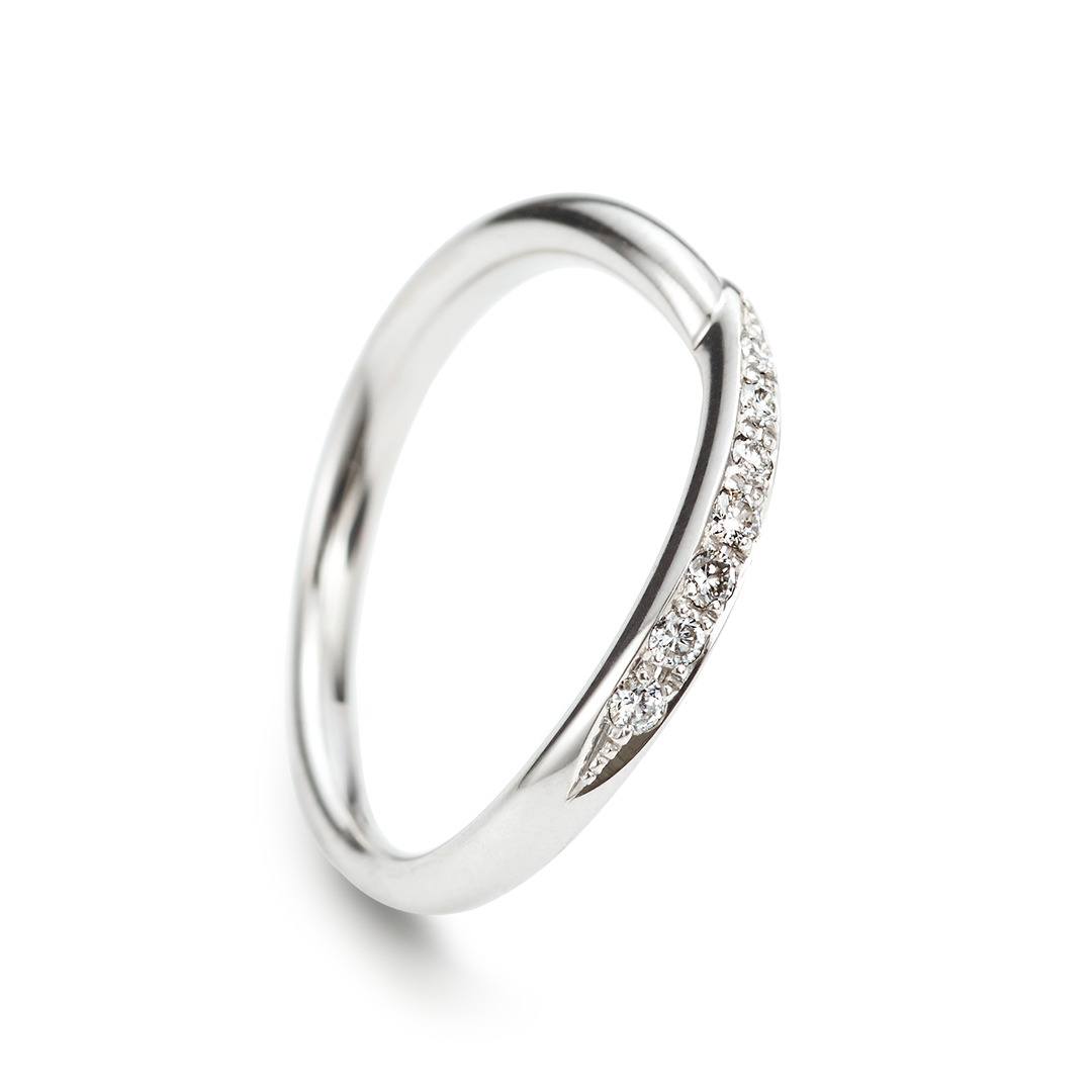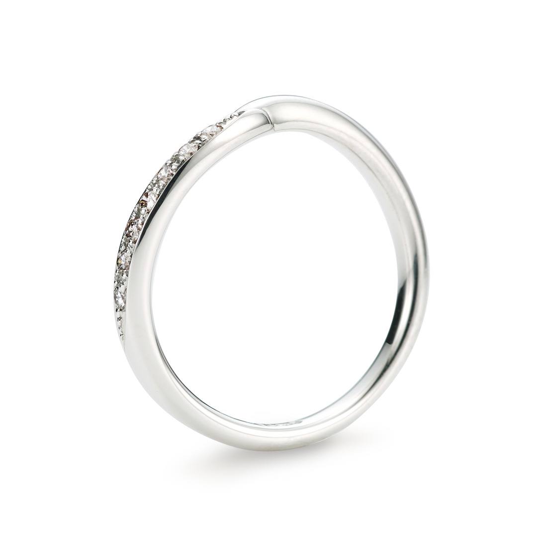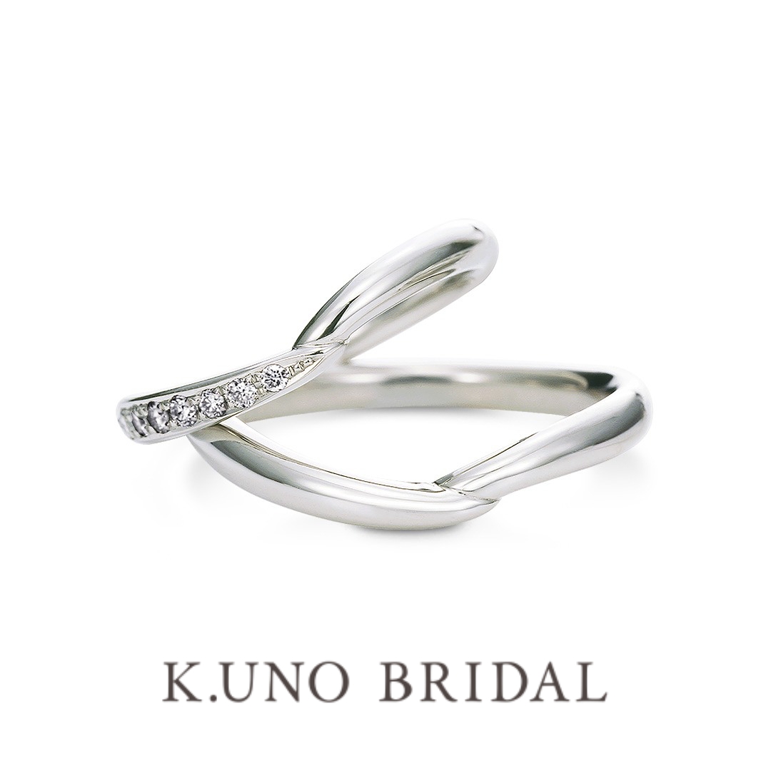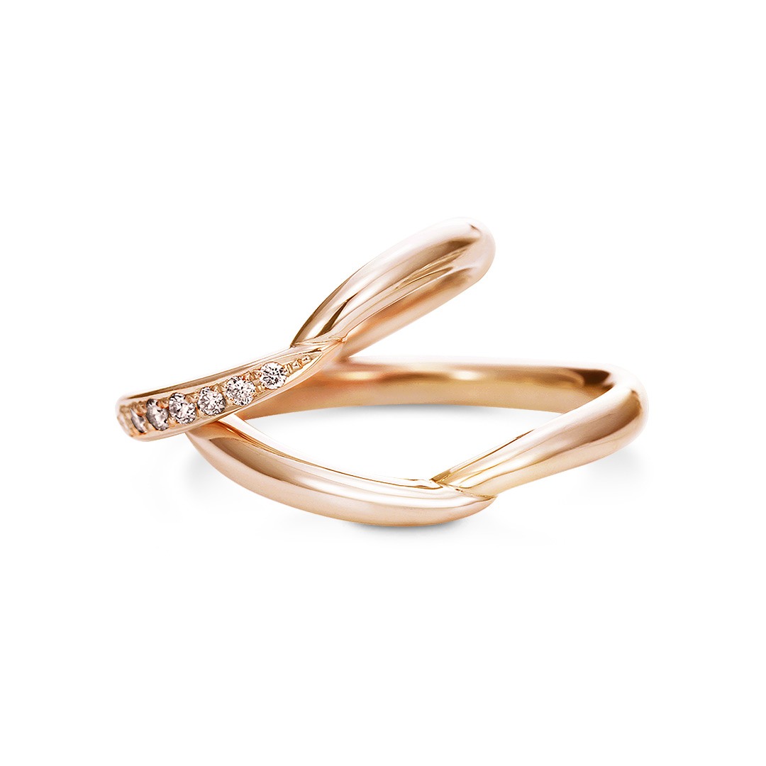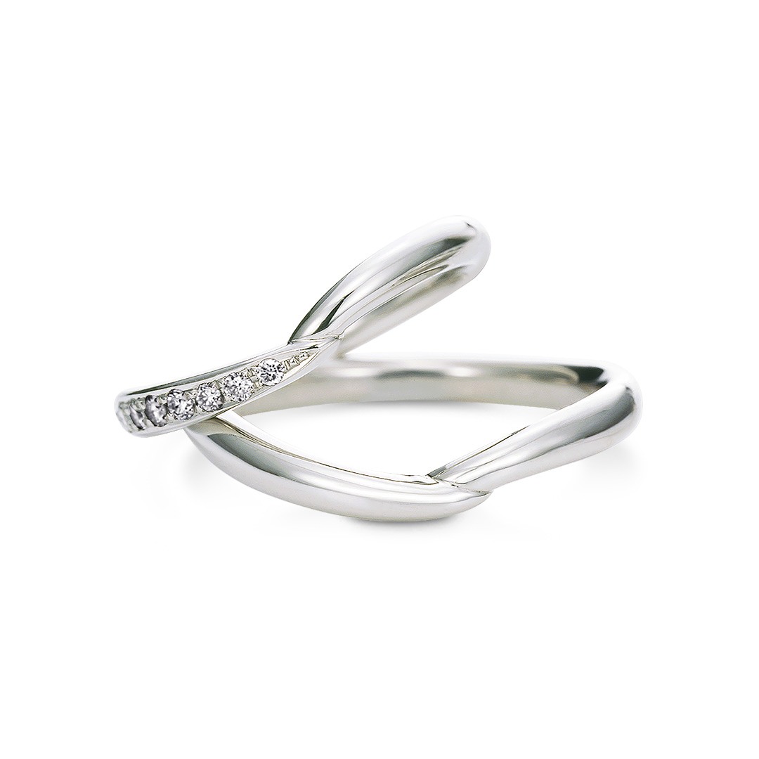 指を綺麗に見せてくれる、丸みのある細身のVライン。片方にはメレダイヤを並べてエレガントに。