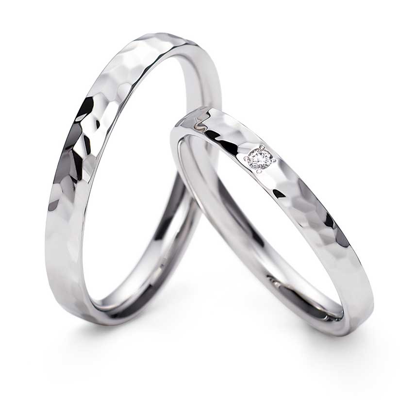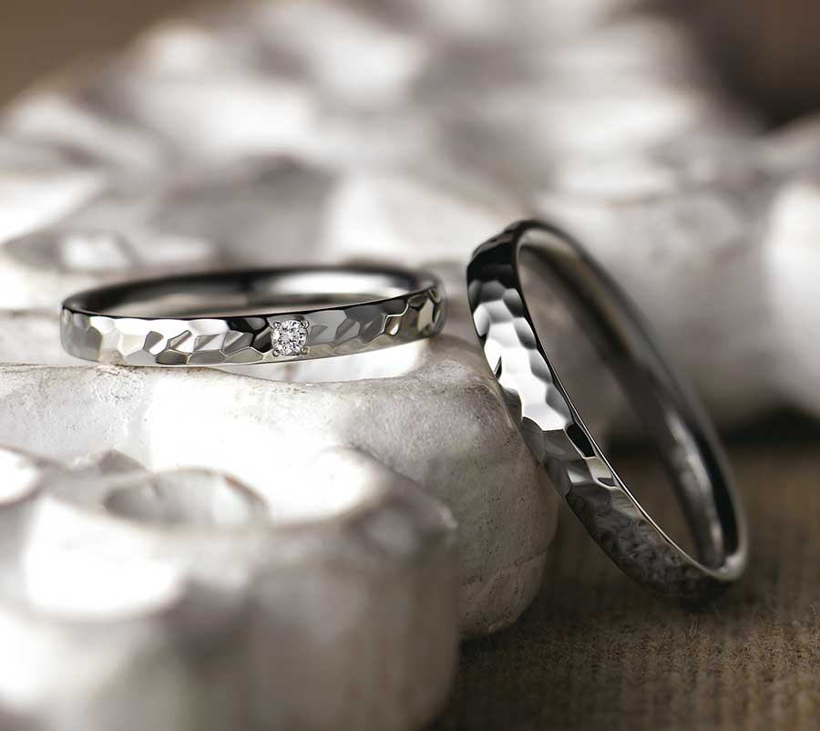 光の角度によりさまざまな輝きをみせる槌目模様のリングです。