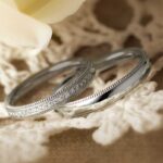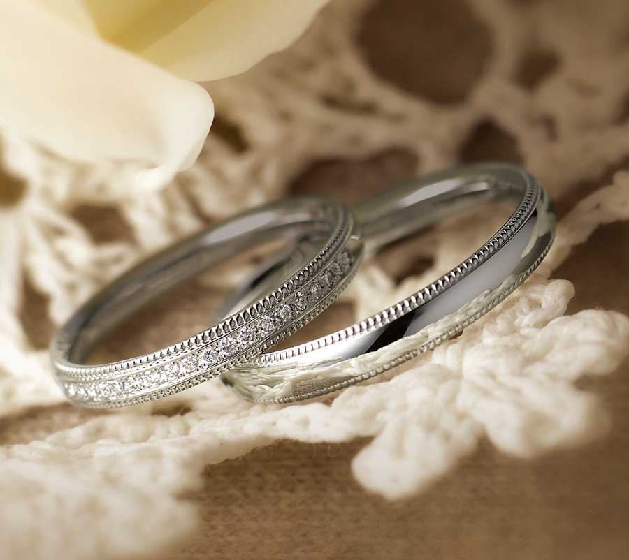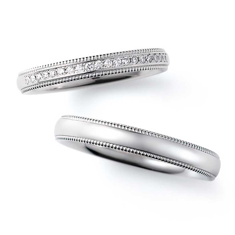 両端にミルグレインを施したリングは、繊細かつ上品な美しさが印象的。