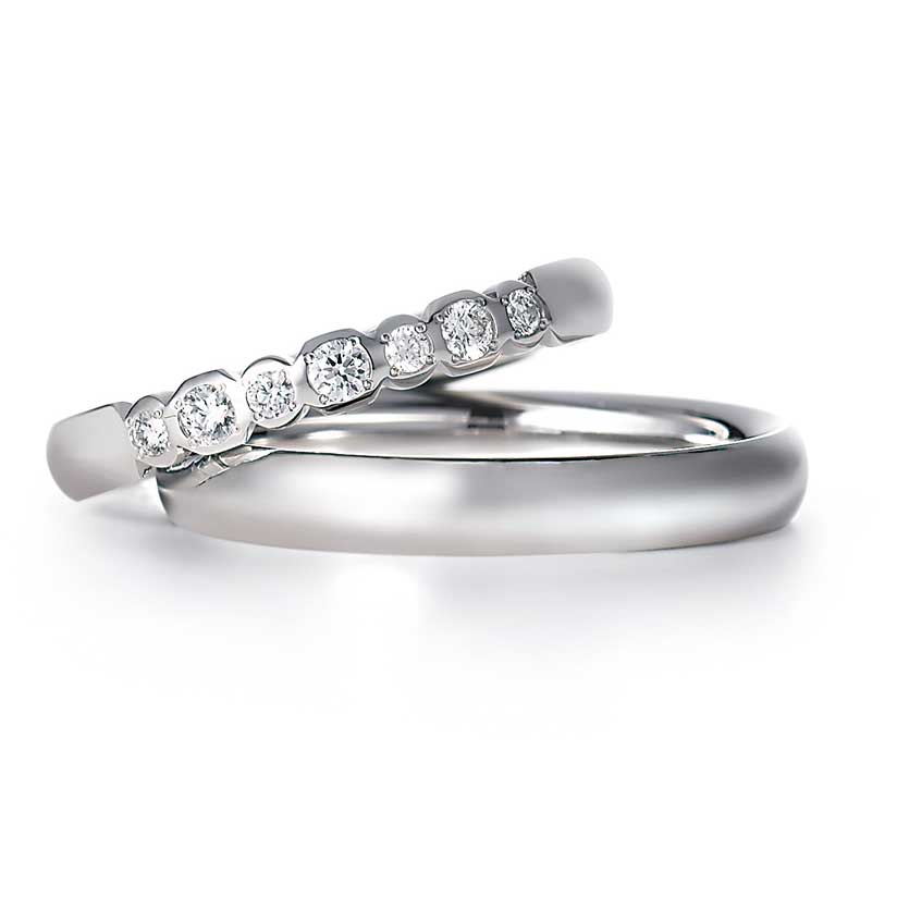 大小のダイヤモンドがリズミカルに並ぶデザインは、高い技術力を要する側面カットで仕上げています。