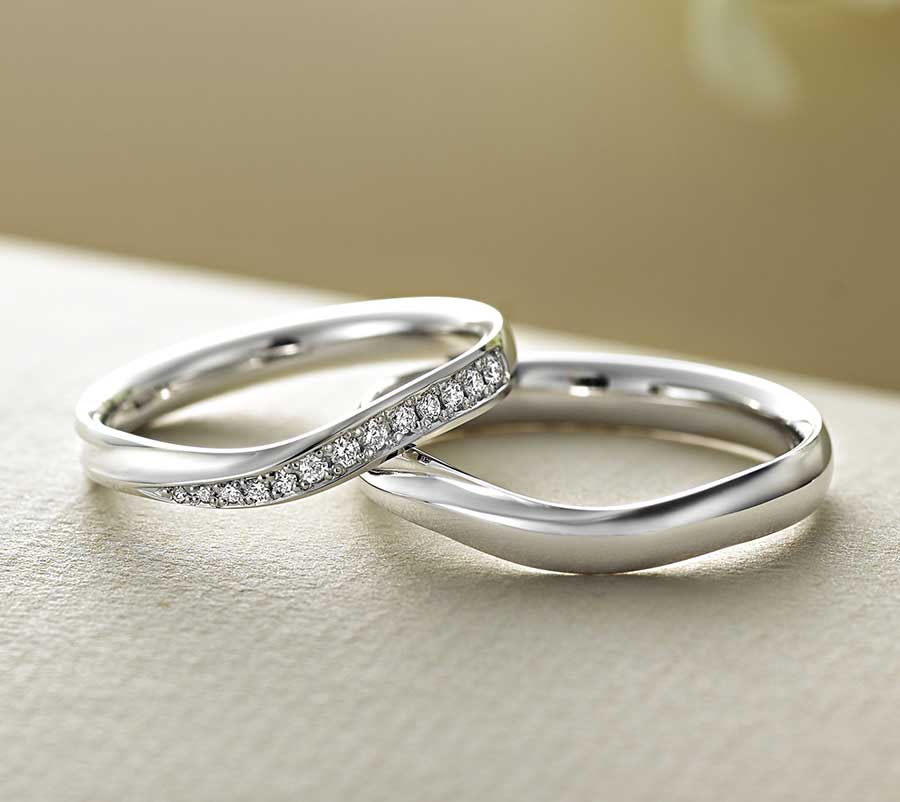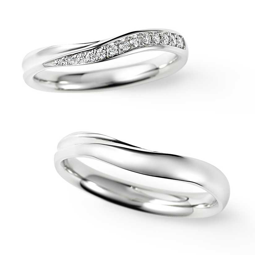 柔らかなVラインのデザインは、マリッジリングの新定番。指が長く美しく見えると人気があります。