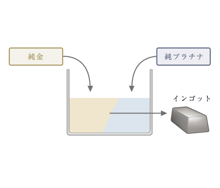 ① 純プラチナ(Pt999)と純金(K24)を1:1の量で混ぜ合わせインゴットを作ります。