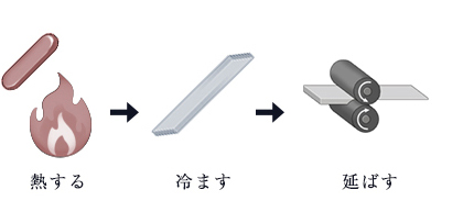 ② インゴットに熱を加えては冷やし、圧延することを何度も繰り返し硬度を上げていきます。